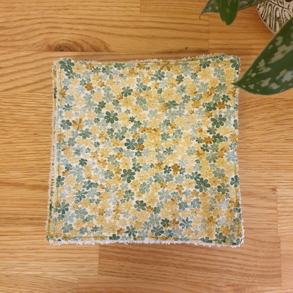 Essuie-tout lavable de 16 cm de coté, côté pile en coton côté face en tissu éponge. Modèle « fleurs vertes ».
