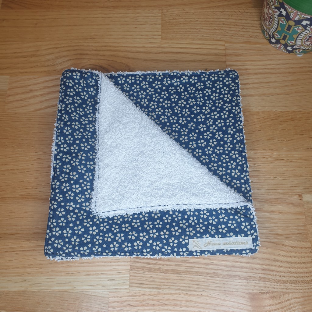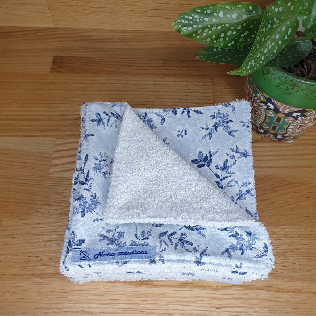 Essuie-tout de 18 cm de côté, côté pile en coton côté face en tissu éponge. Modèle « fleurs bleues ».