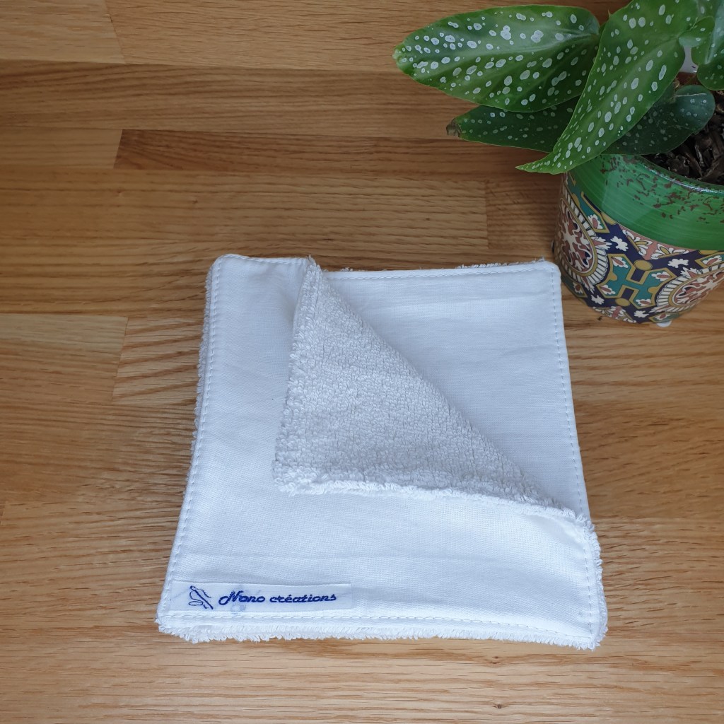 Essuie-tout de 15 cm de côté, côté pile en coton côté face en tissu éponge. Modèle « blanc ».