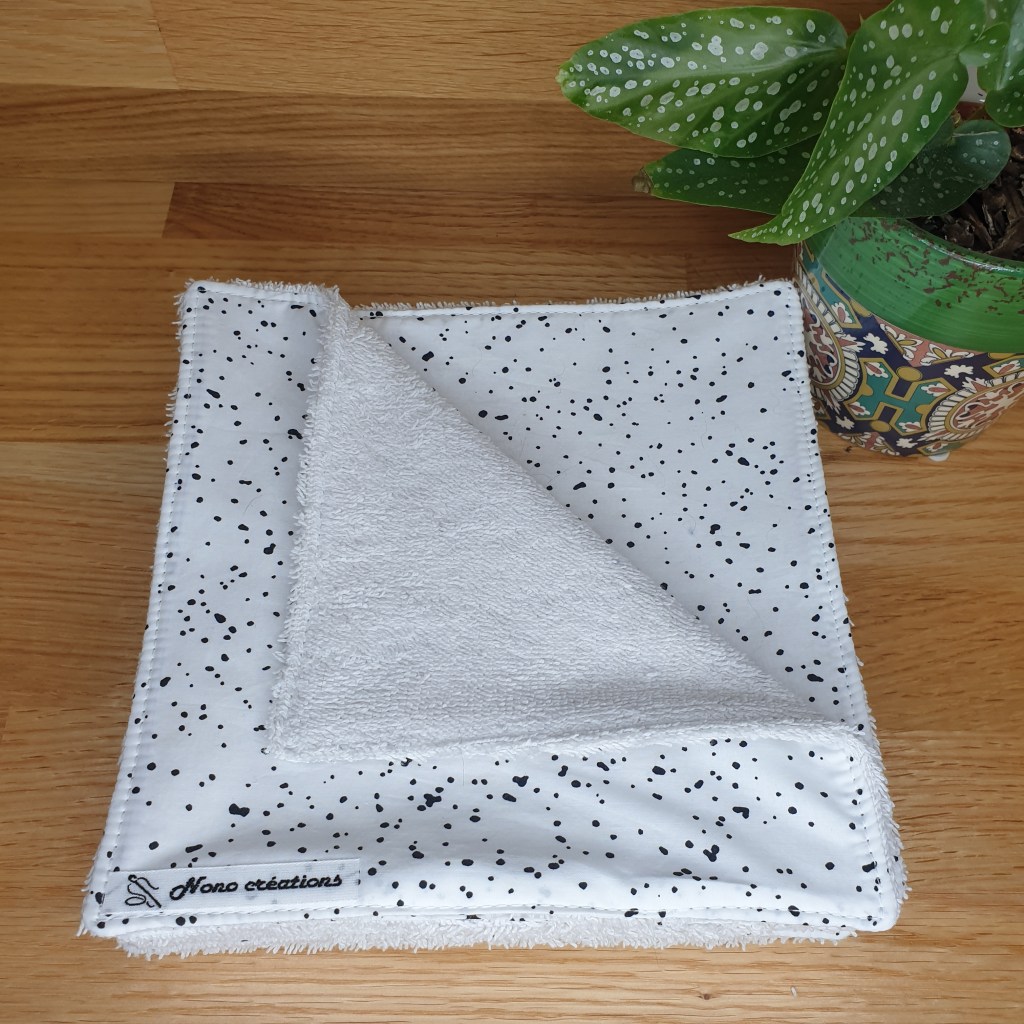 Essuie-tout de 18,5 cm de côté, côté pile en coton côté face en tissu éponge. Modèle « tâches noires ».