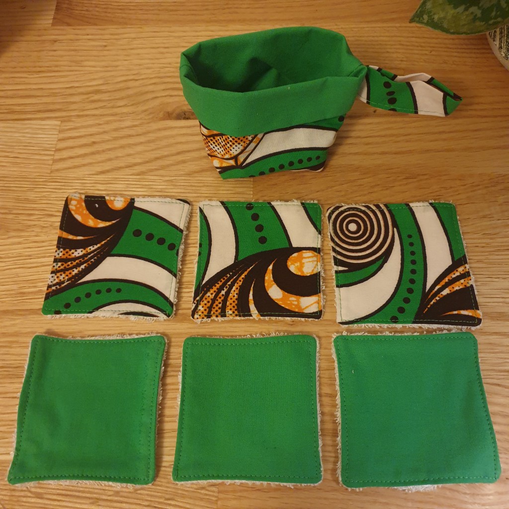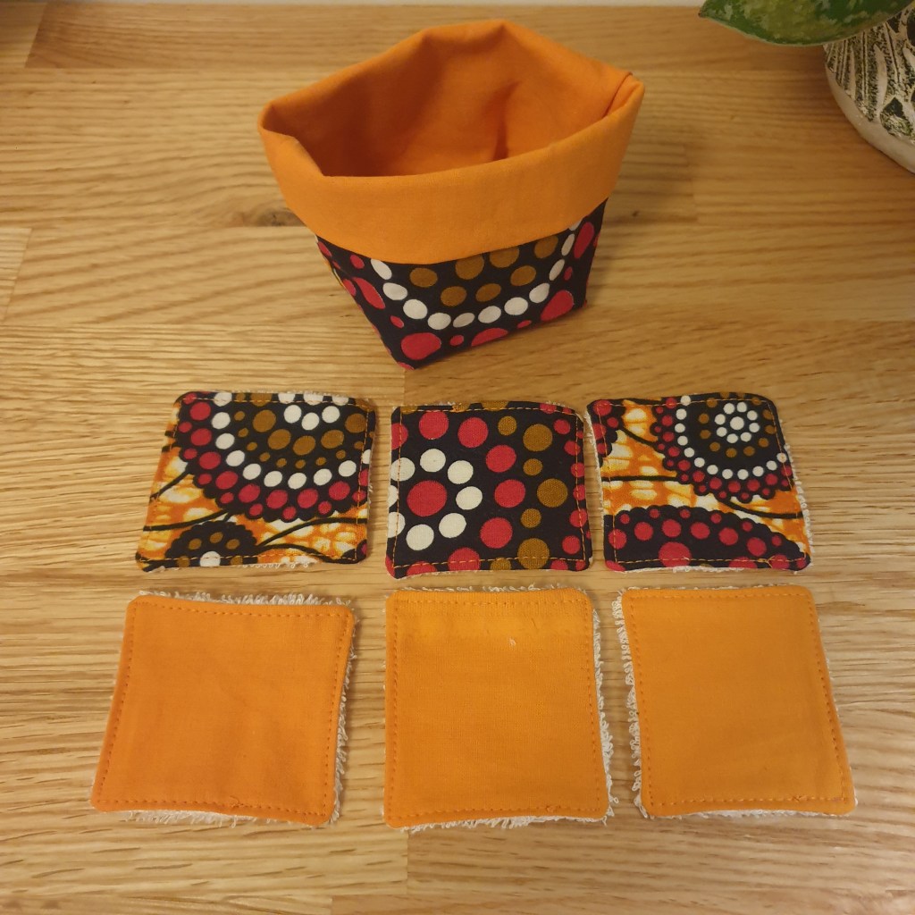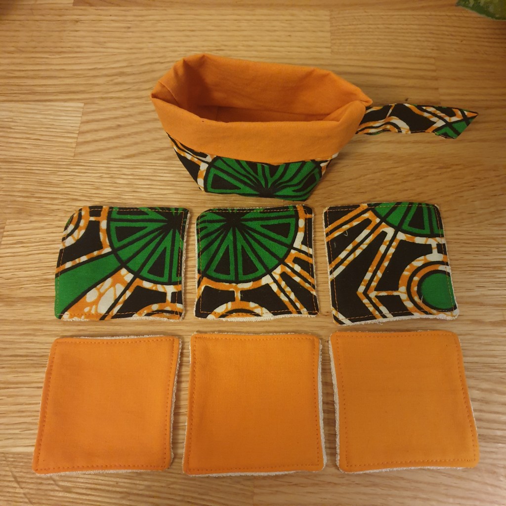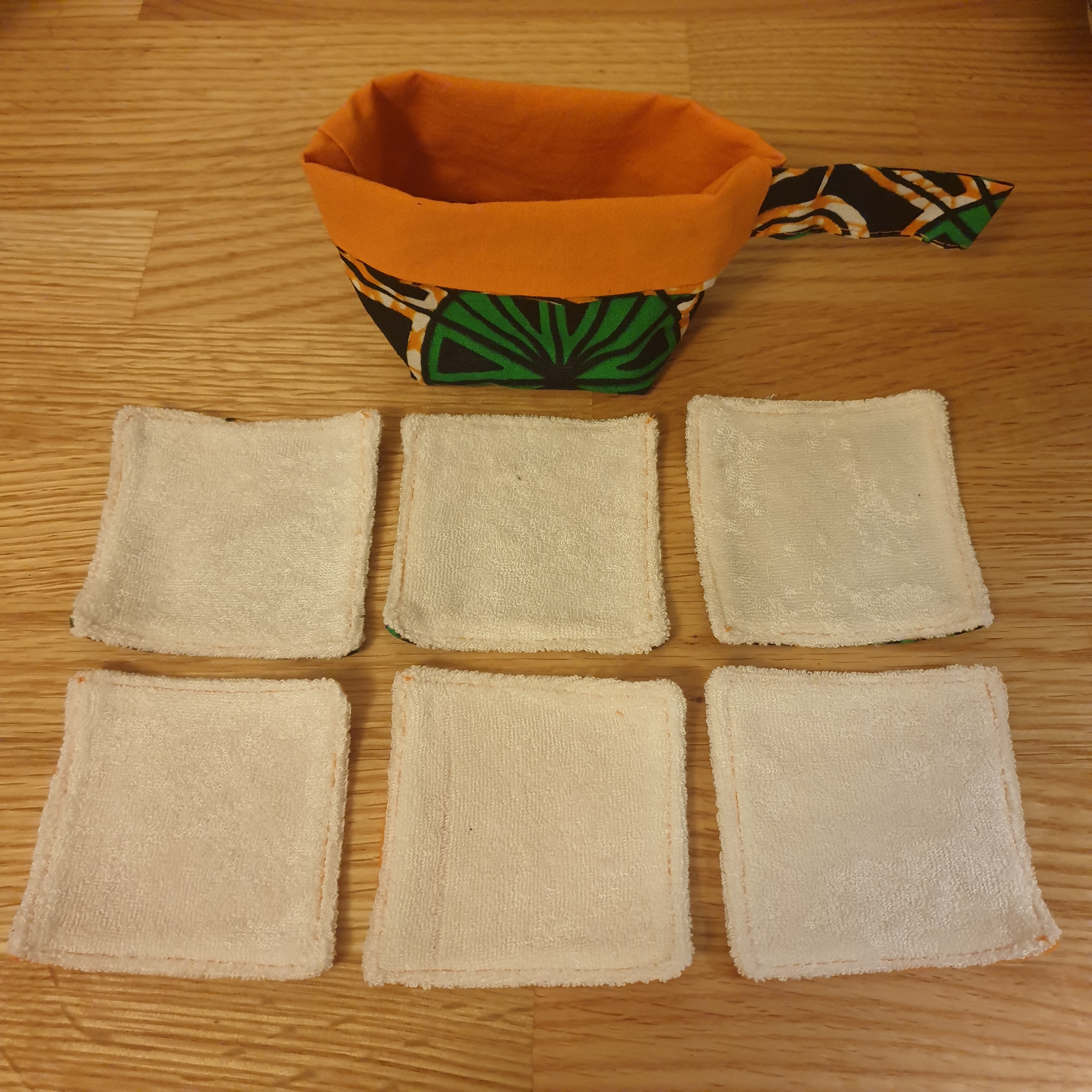 6 lingettes lavables et son panier. Lingettes de 5 cm de côté. Modèle « wax orange/vert ».