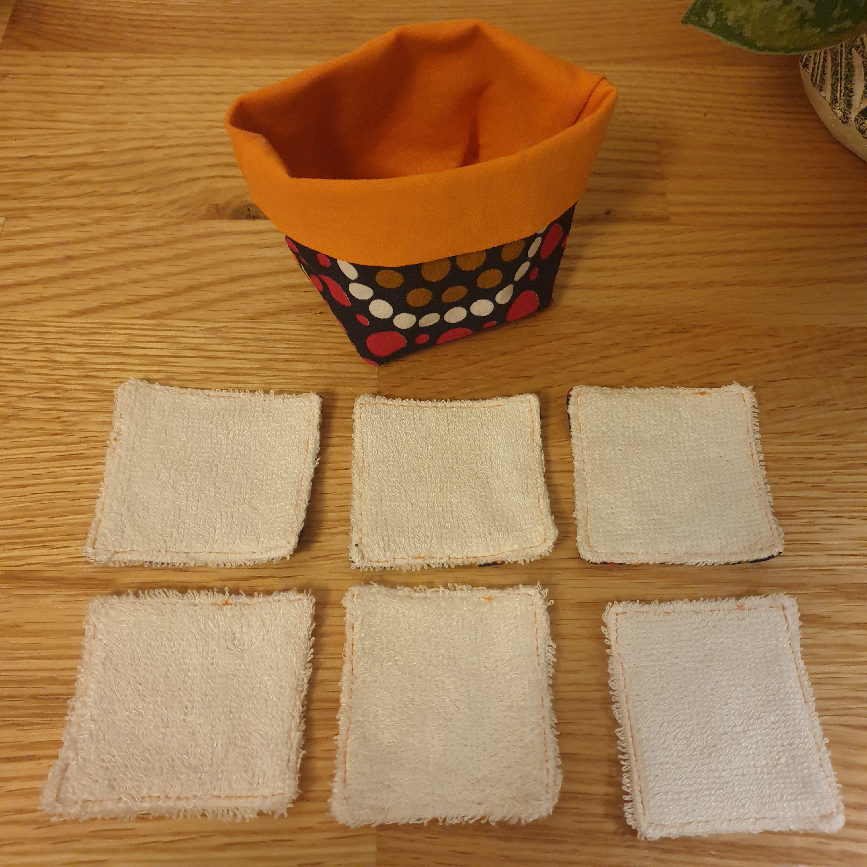 6 lingettes lavables et son panier. Lingettes de 6 cm de côté. Modèle « wax orange/rose ».