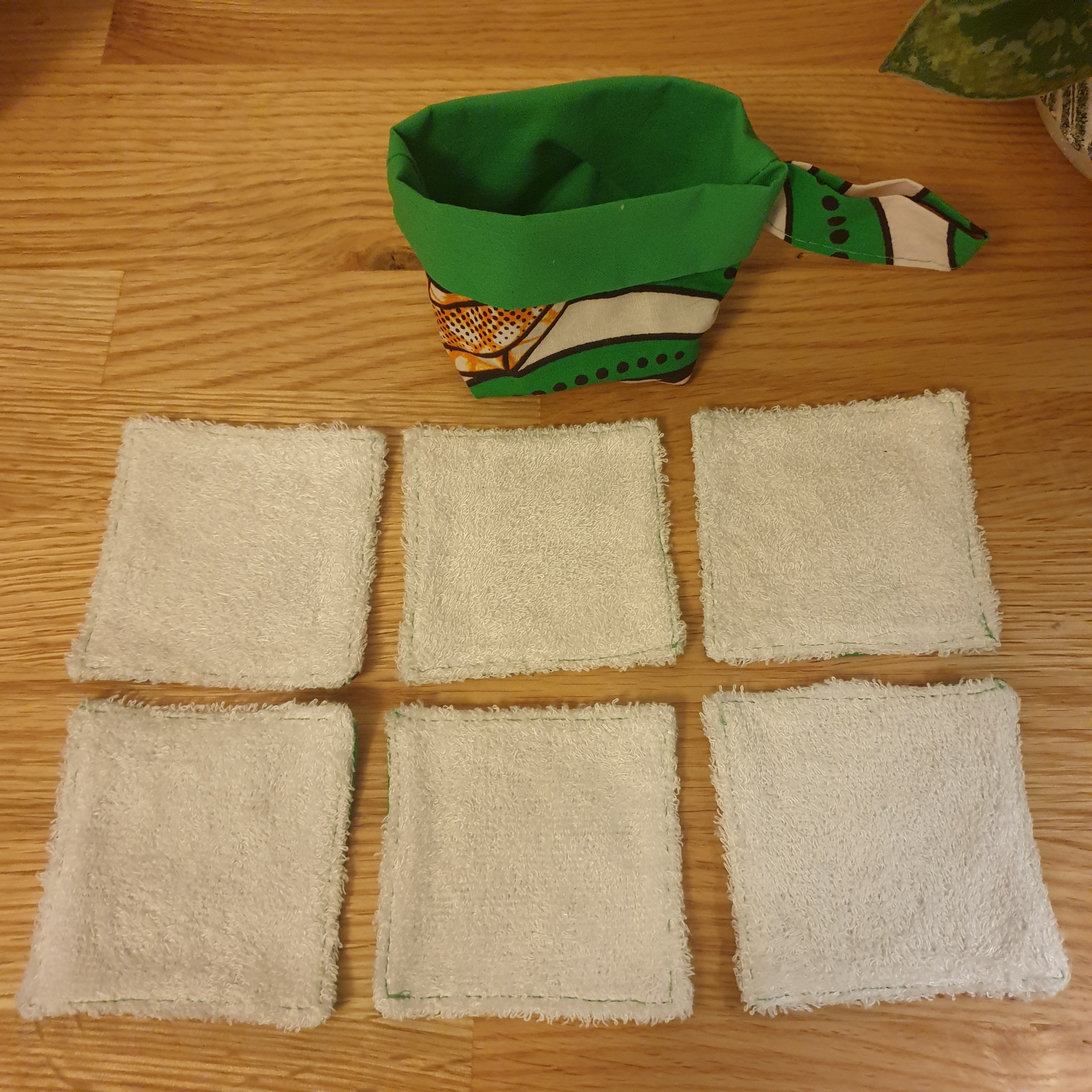 6 lingettes lavables et son panier. Lingettes de 5 cm de côté. Modèle « wax vert ».