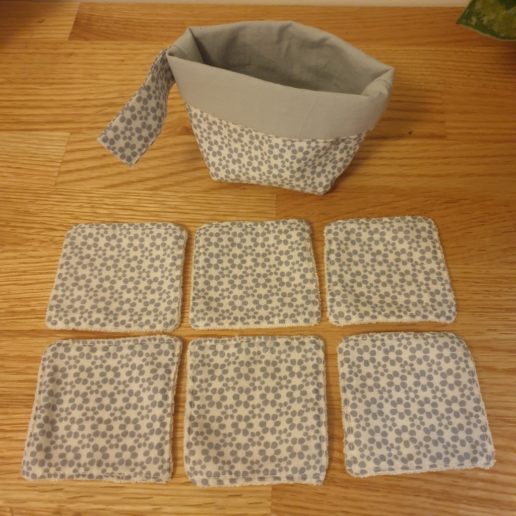 6 lingettes lavables et son panier. Lingettes de 6 cm de côté. Modèle « fleurs grises ».