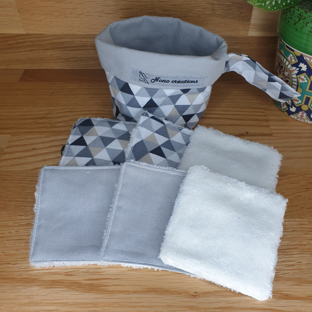 6 lingettes lavables et son panier. Lingettes de 6 cm de côté. Modèle « triangles gris ».