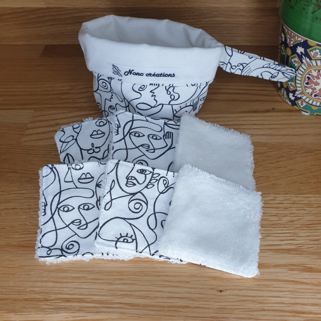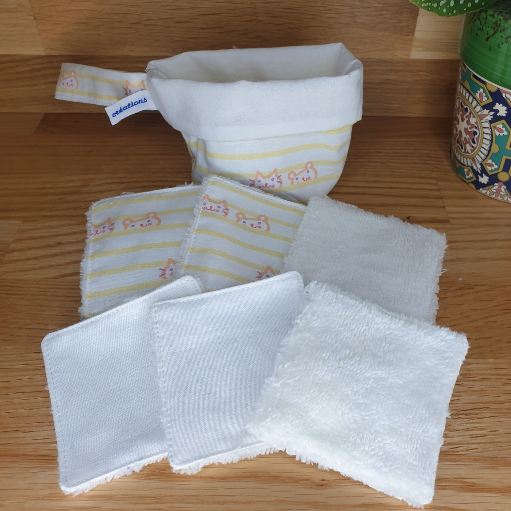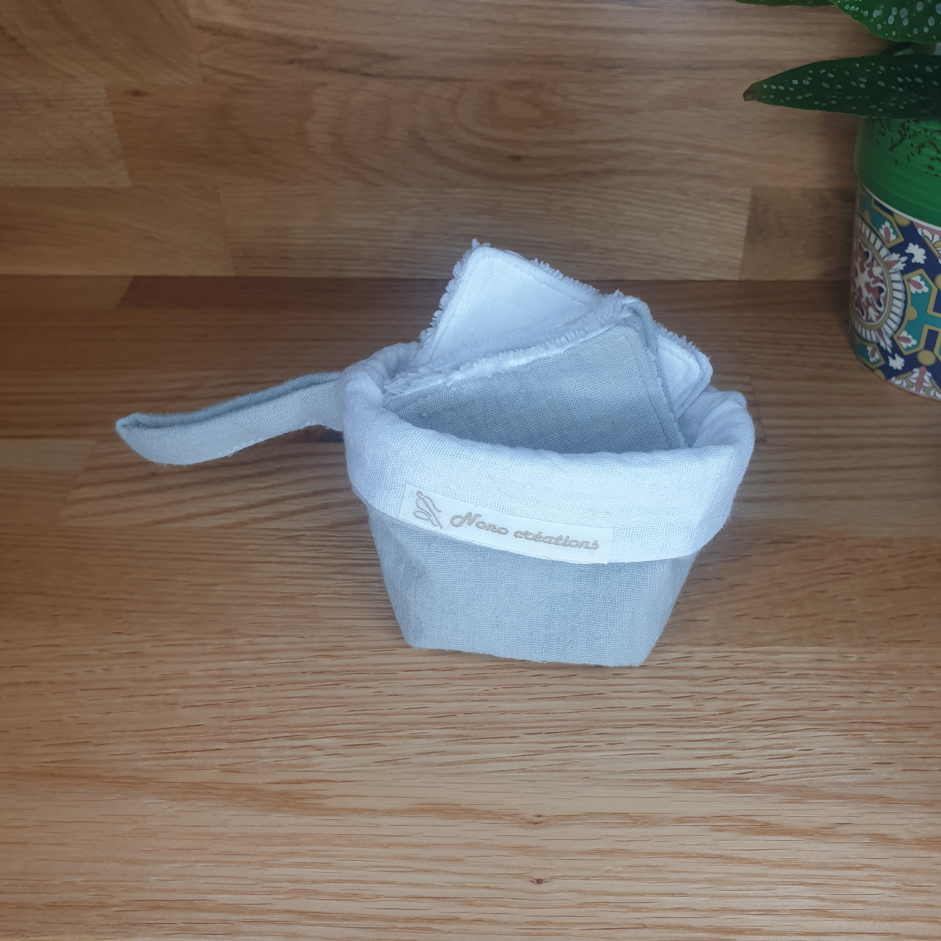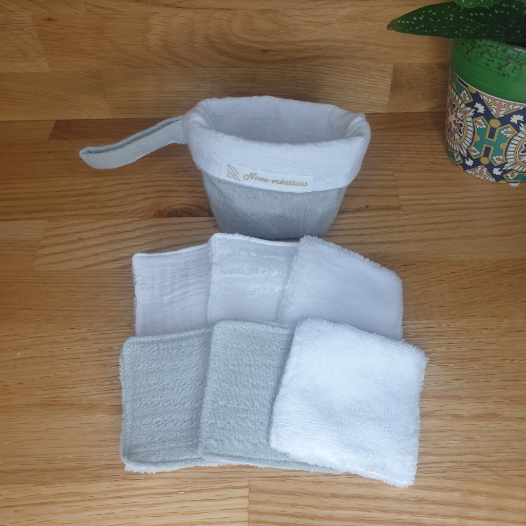Je propose des lingettes lavables avec son panier, venez découvrir les 20 différents modèles. Un supplément de lingette est possible sur demande. Le côté « démaquillant » est à coton de bambou, l’autre côté est soit en coton soit en lin soit en tissu gaze.