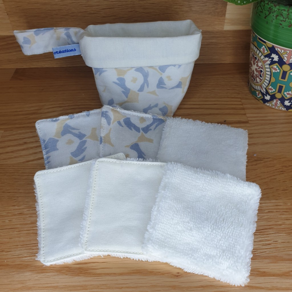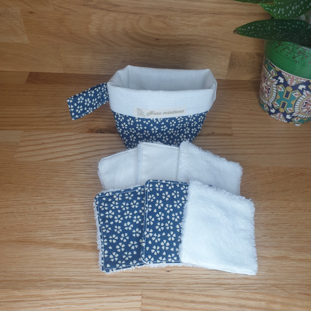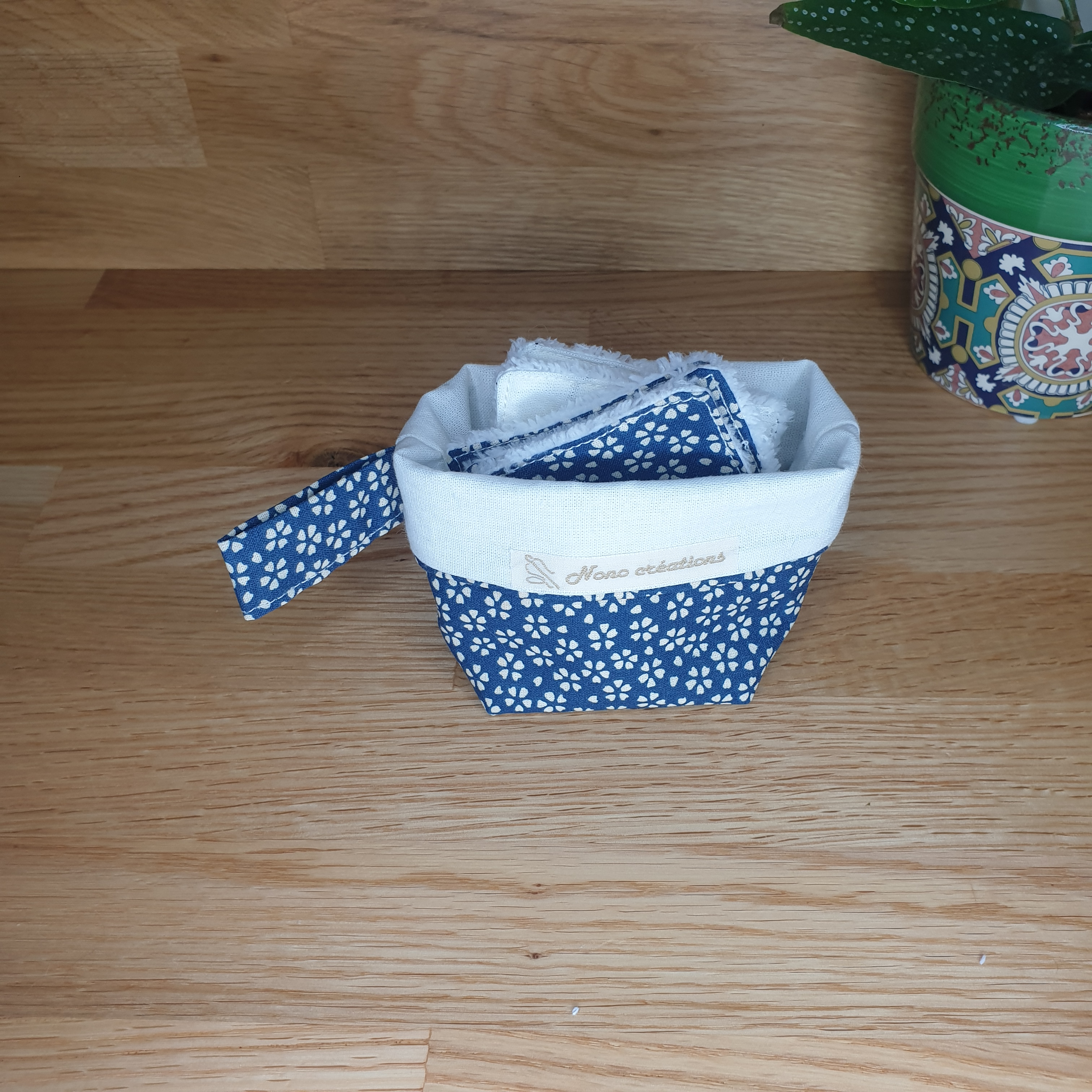 6 lingettes lavables et son panier. Lingettes de 6 cm de côté. Modèle « bleu ».