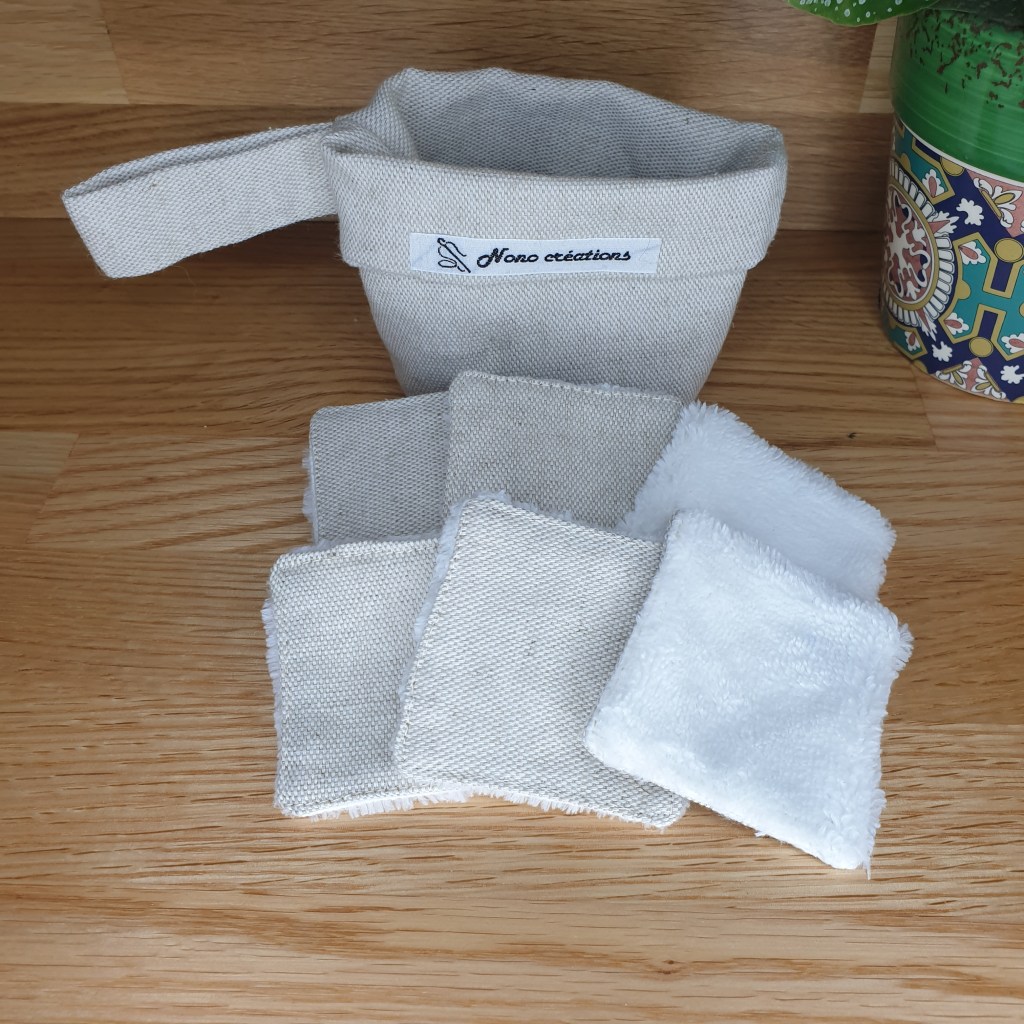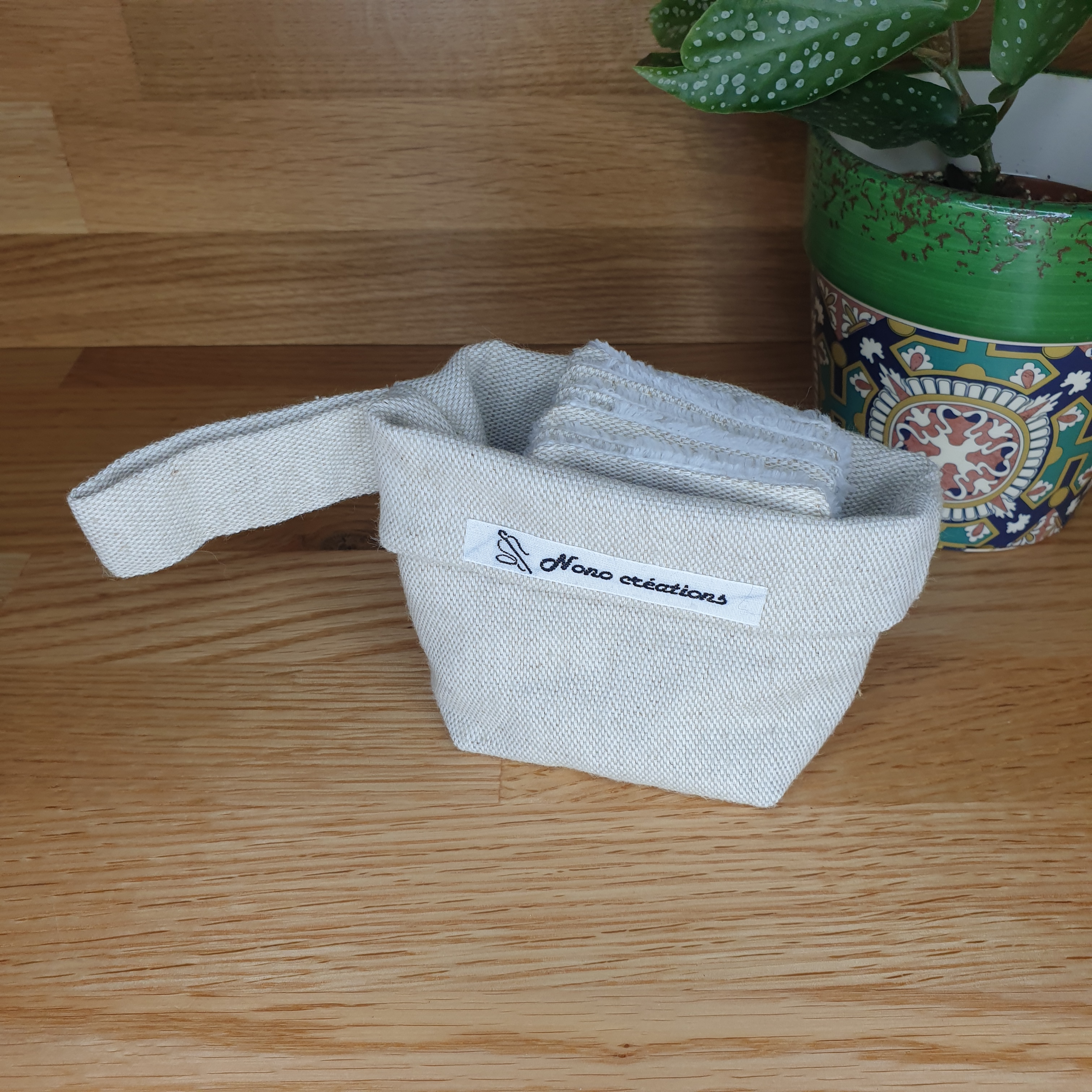 6 lingettes lavables et son panier. Lingettes de 5,5 cm de côté. Modèle « lin ».