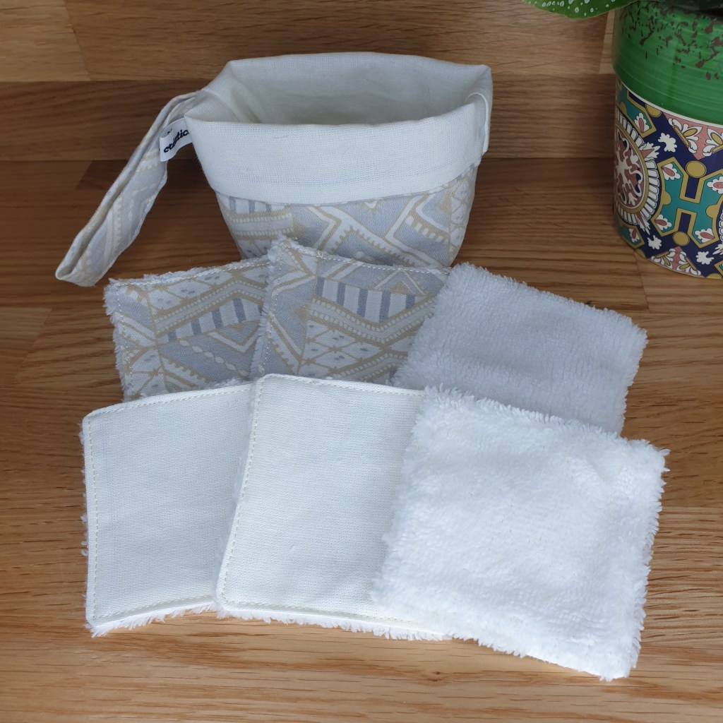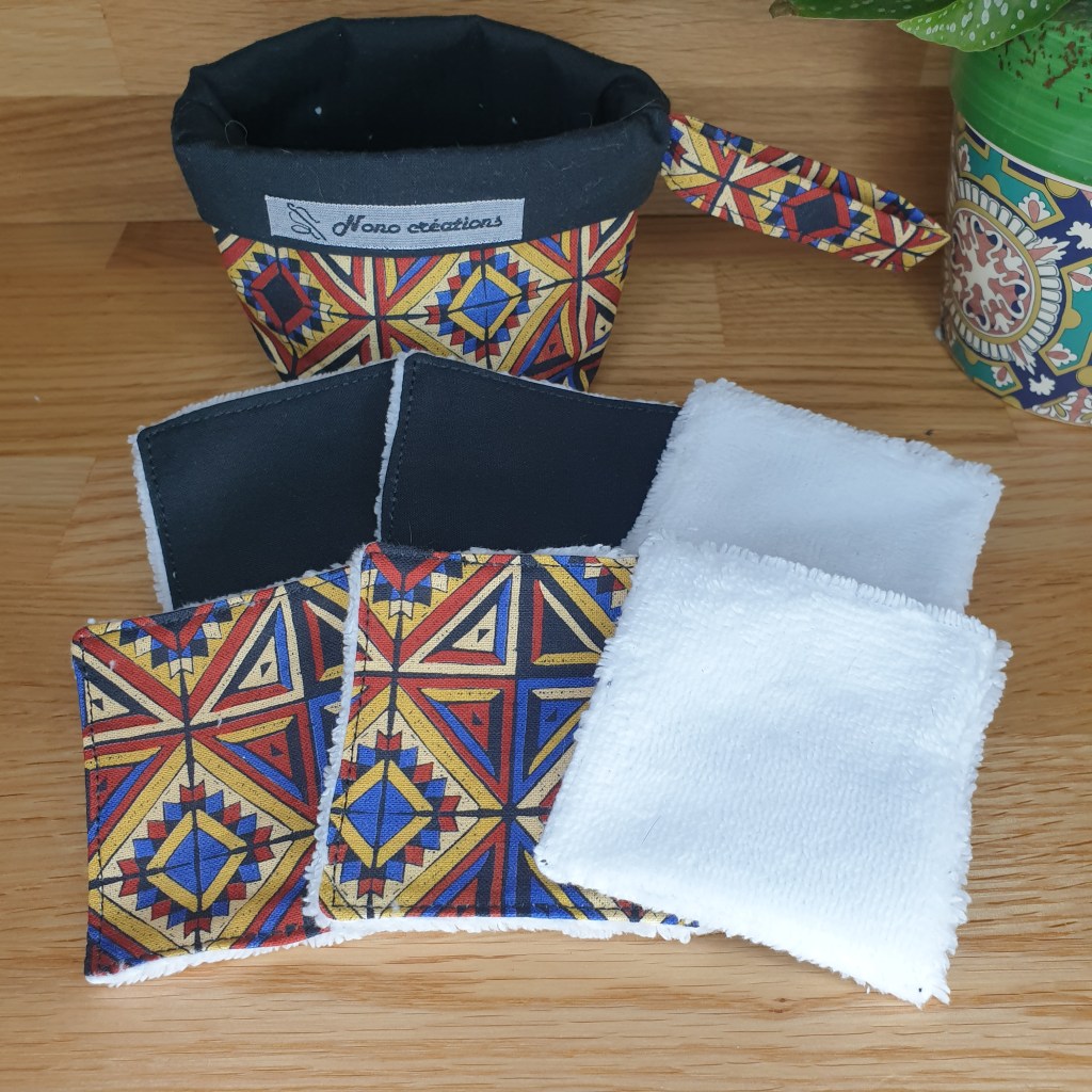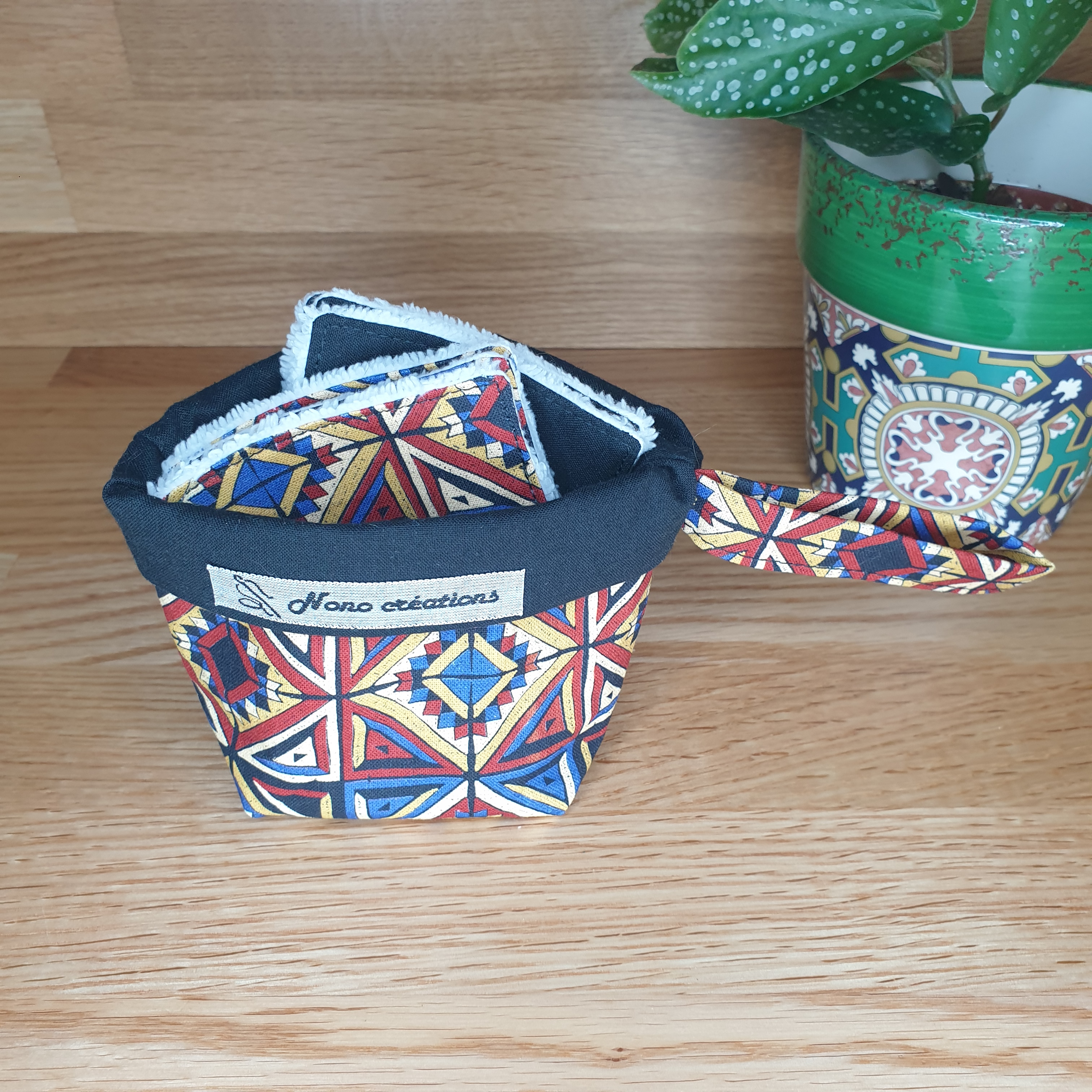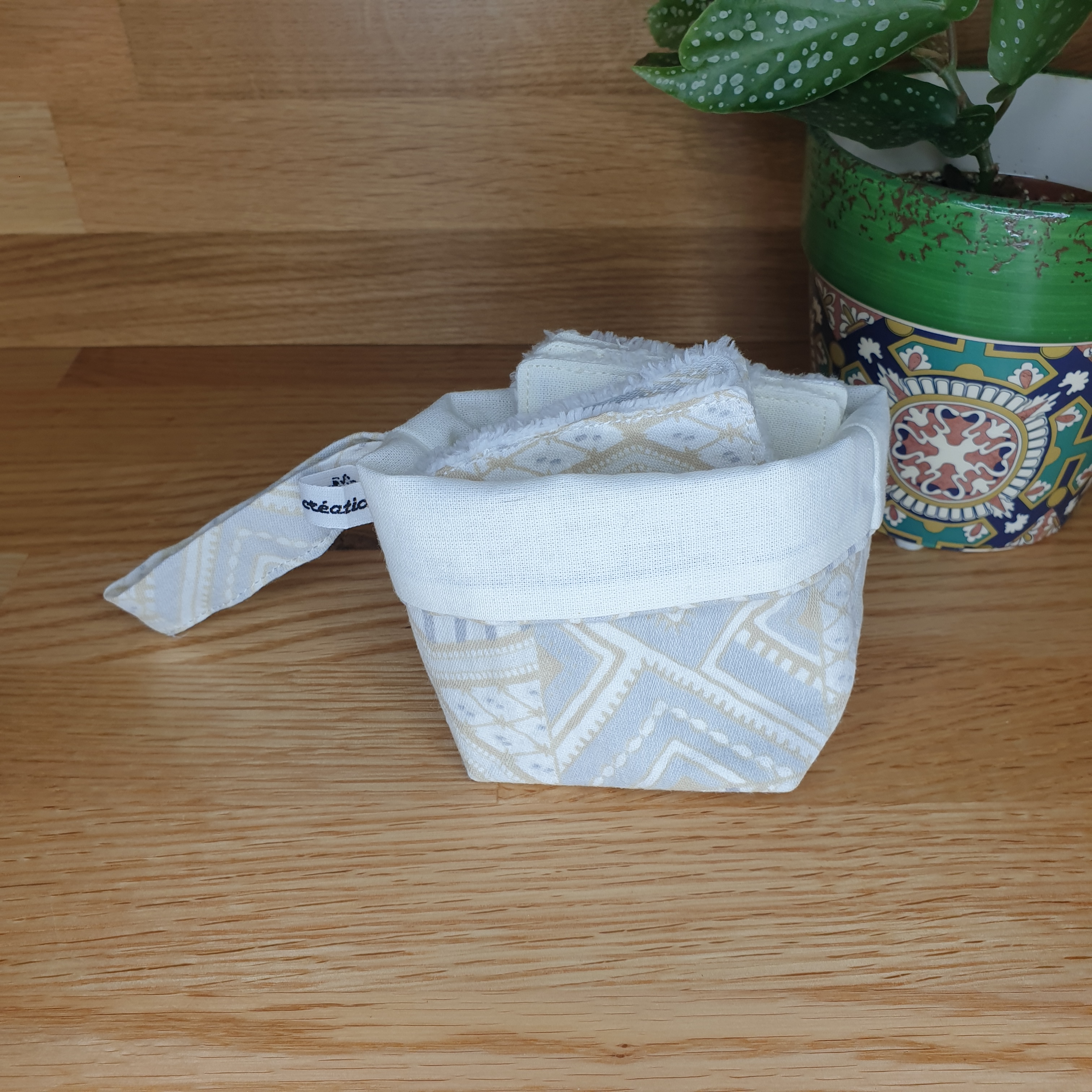 6 lingettes lavables et son panier. Lingettes de 6 cm de côté. Modèle « géométrique ».