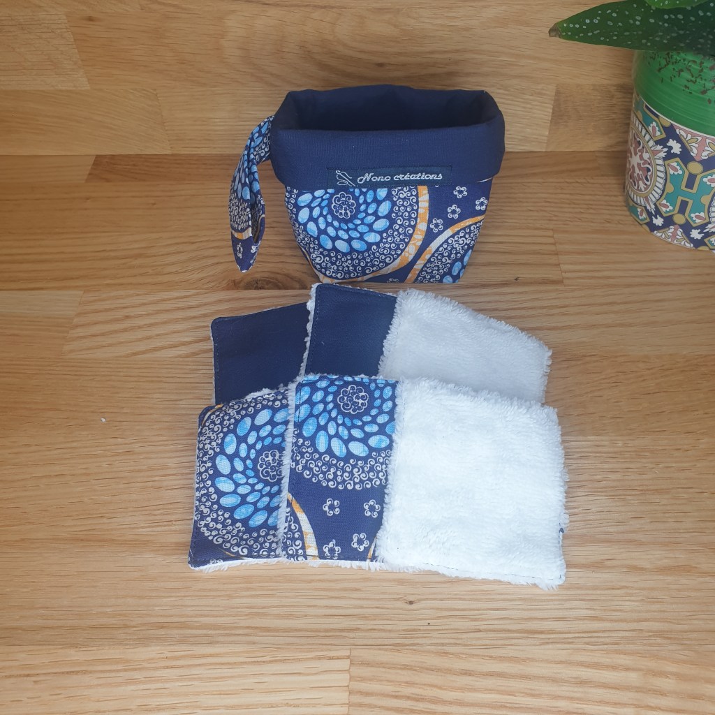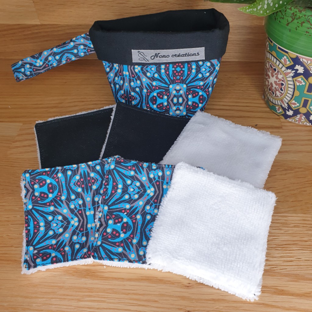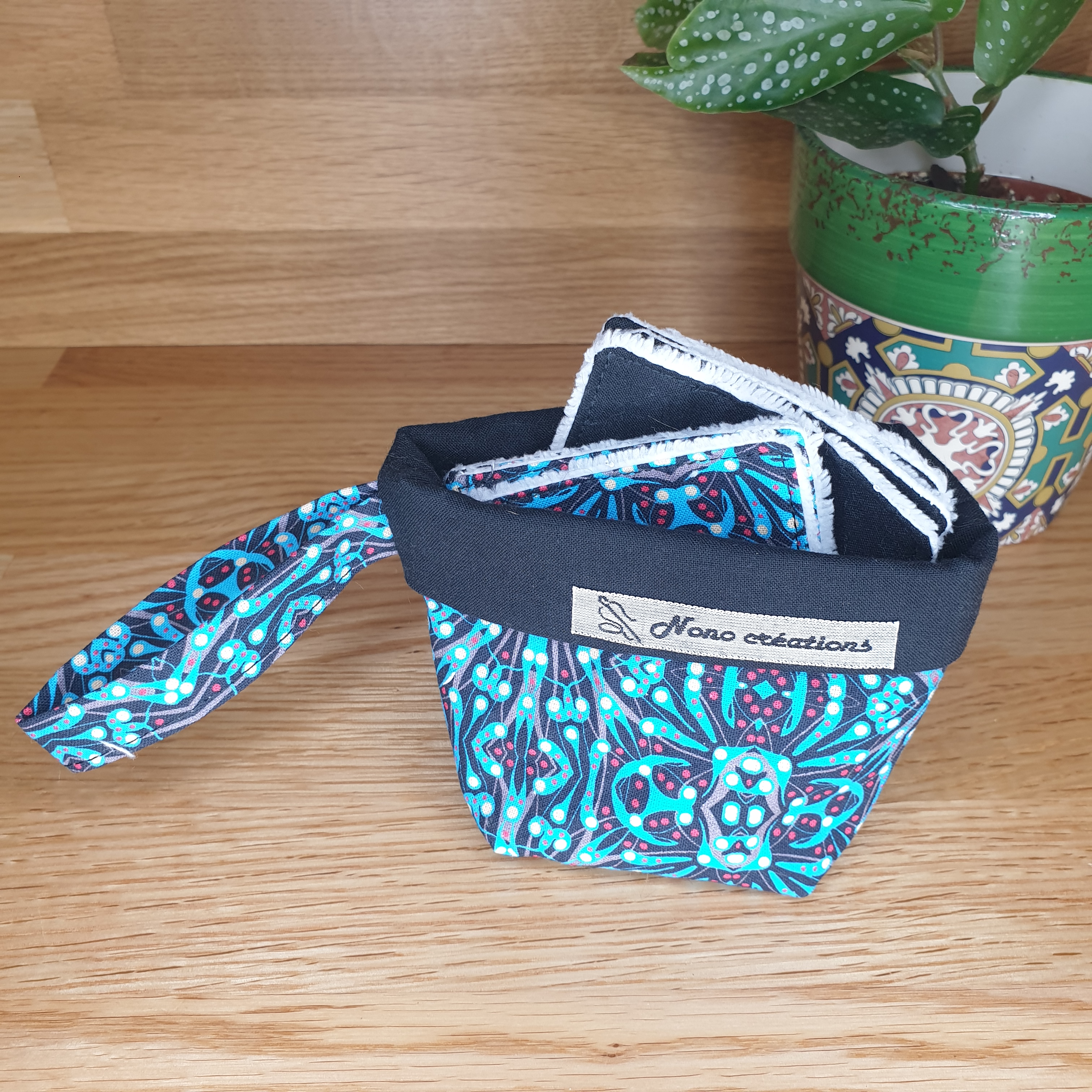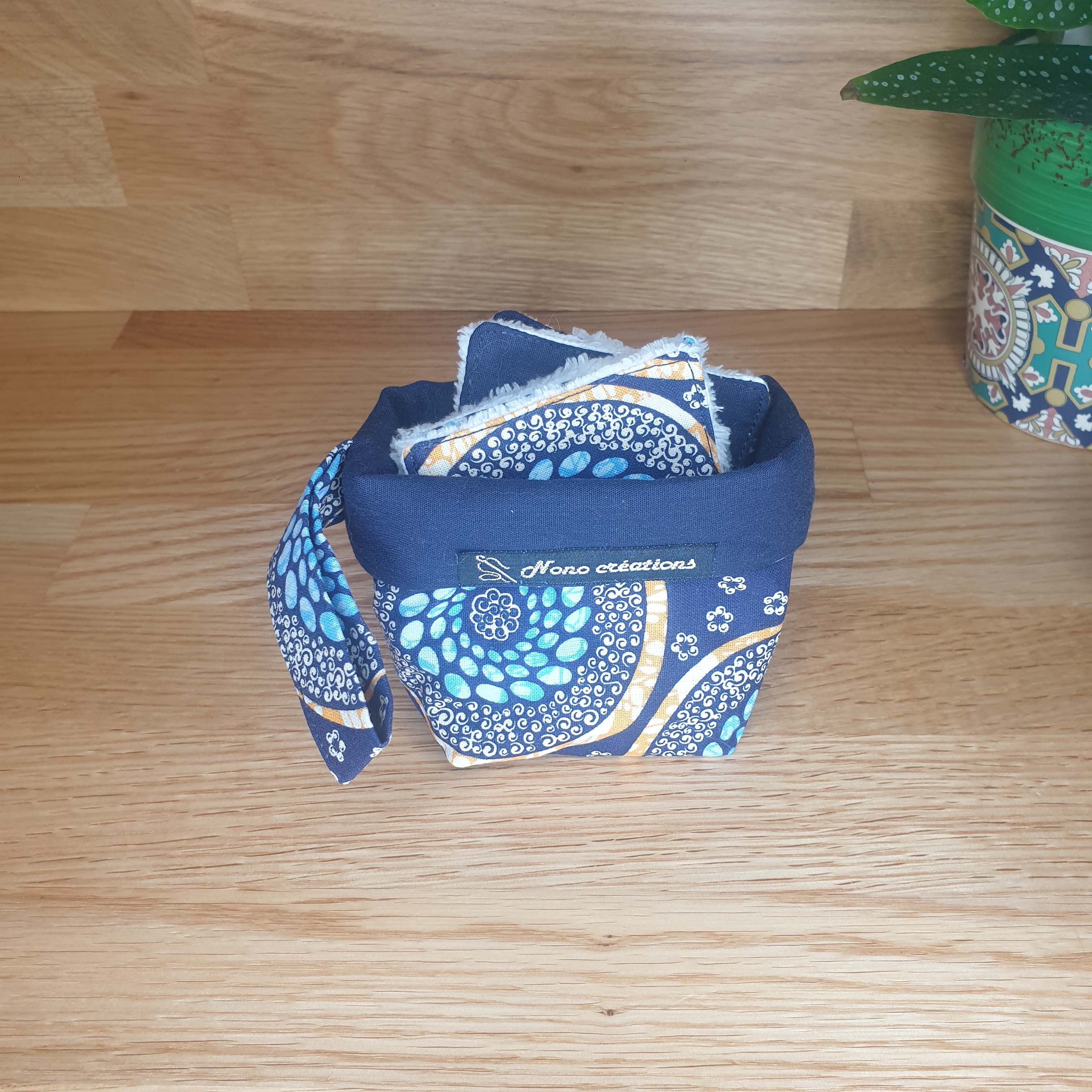 6 lingettes lavables et son panier. Lingettes de 6 cm de côté. Modèle « masque bleu ».