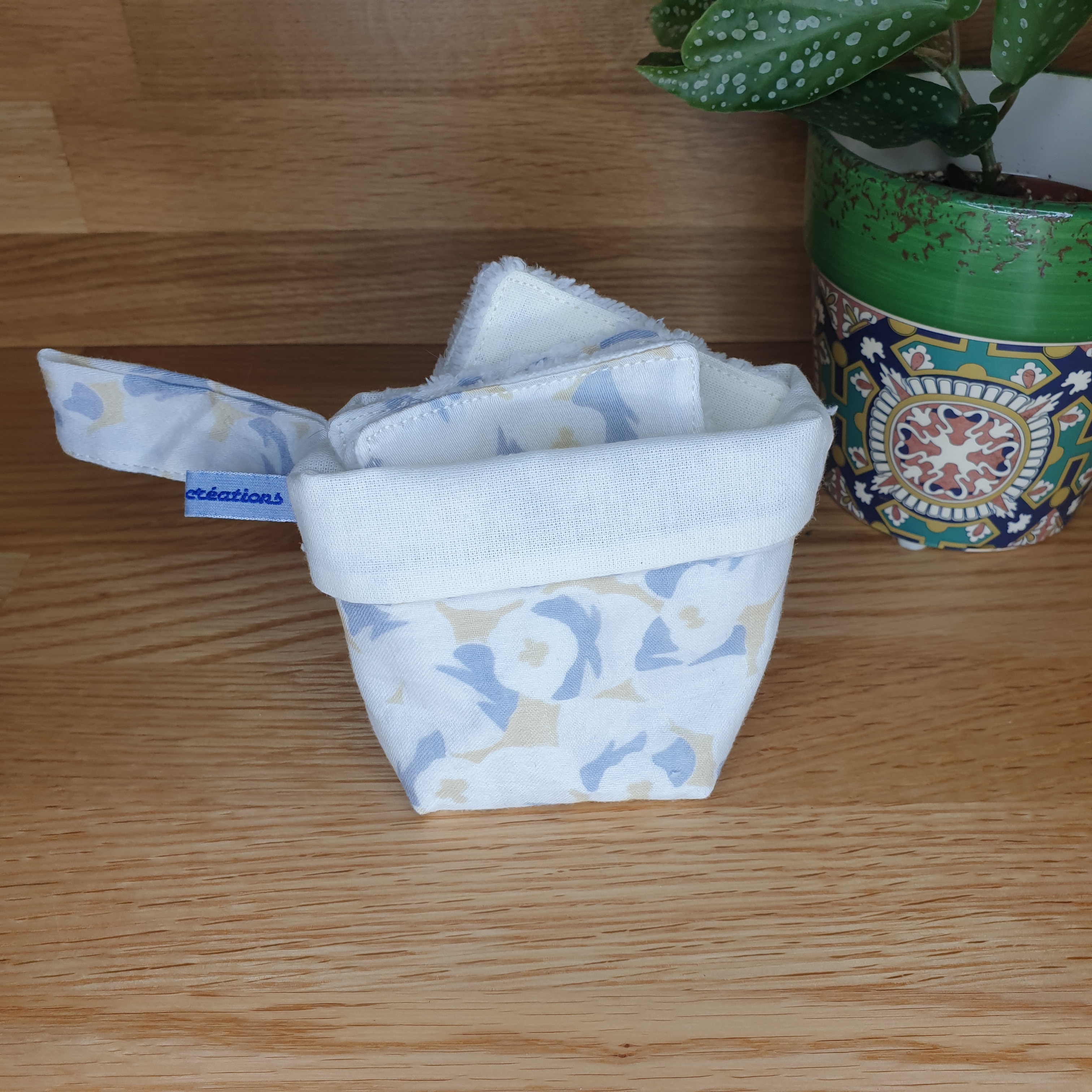 6 lingettes lavables et son panier. Lingettes de 6 cm. Modèle « fleurs bleues ».