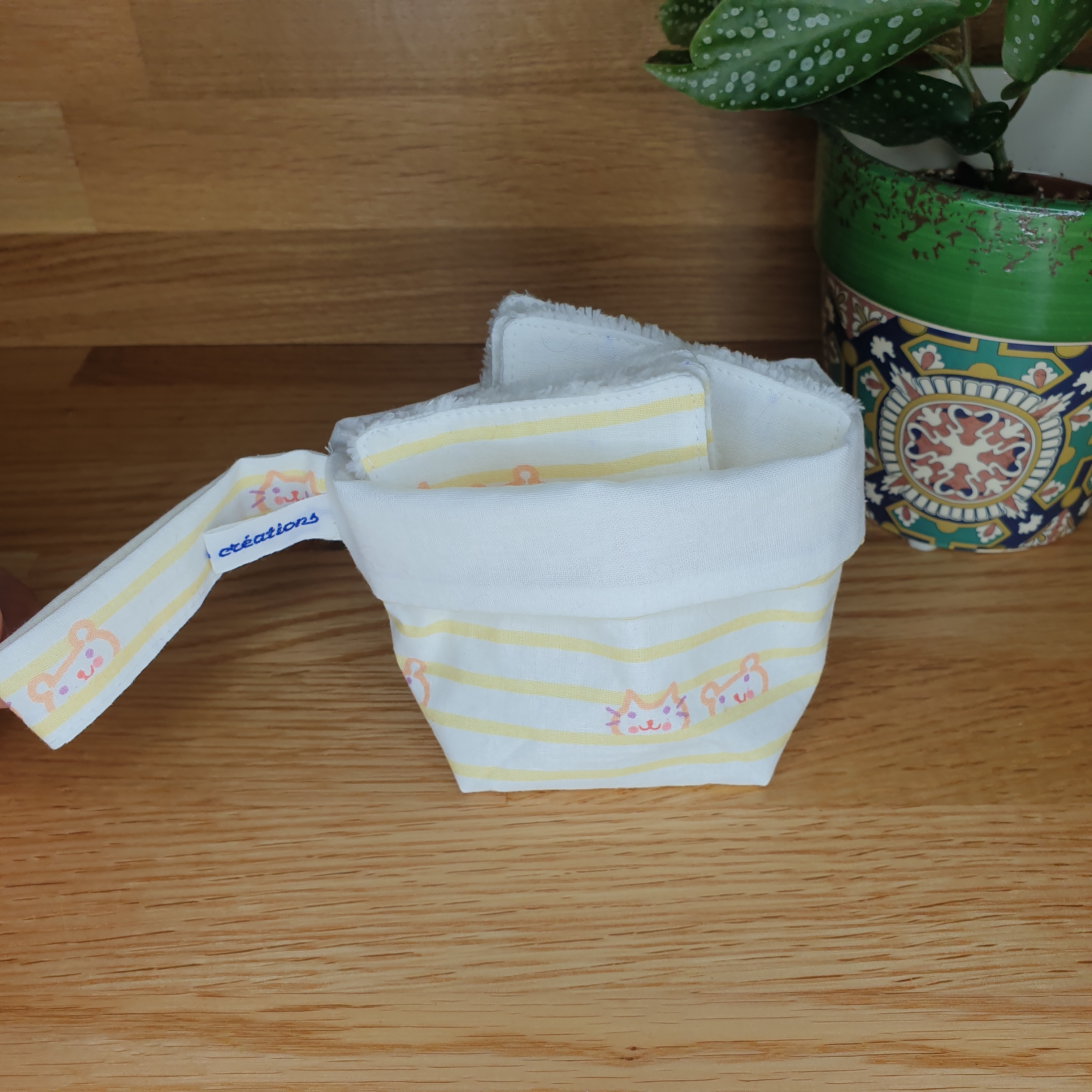 6 lingettes lavables et son panier. Lingettes de 6 cm de côté. Modèle « petits chats ».