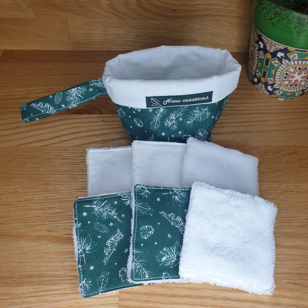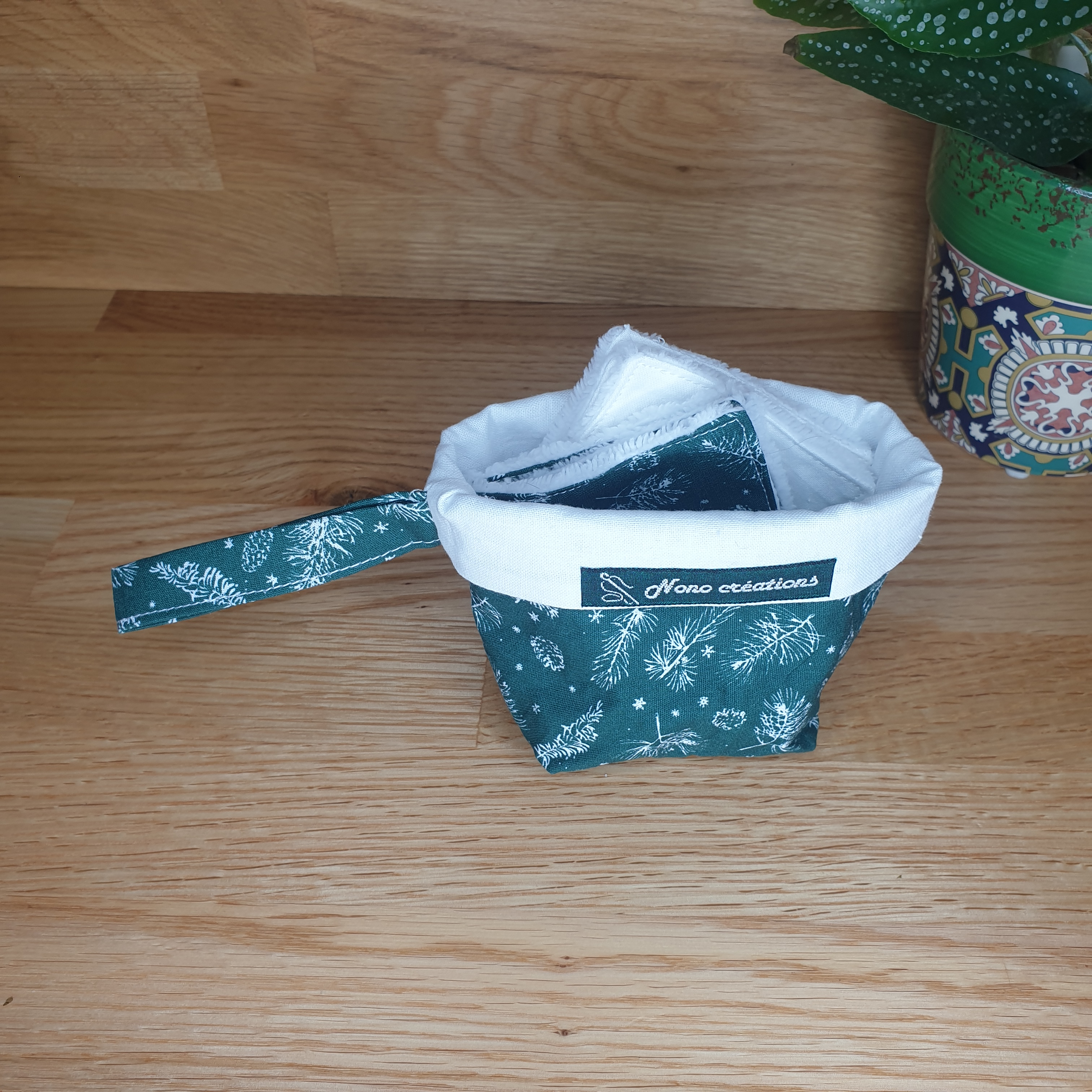 6 lingettes lavables et son panier. Lingettes de 6 cm de côté. Modèle « sapin ».