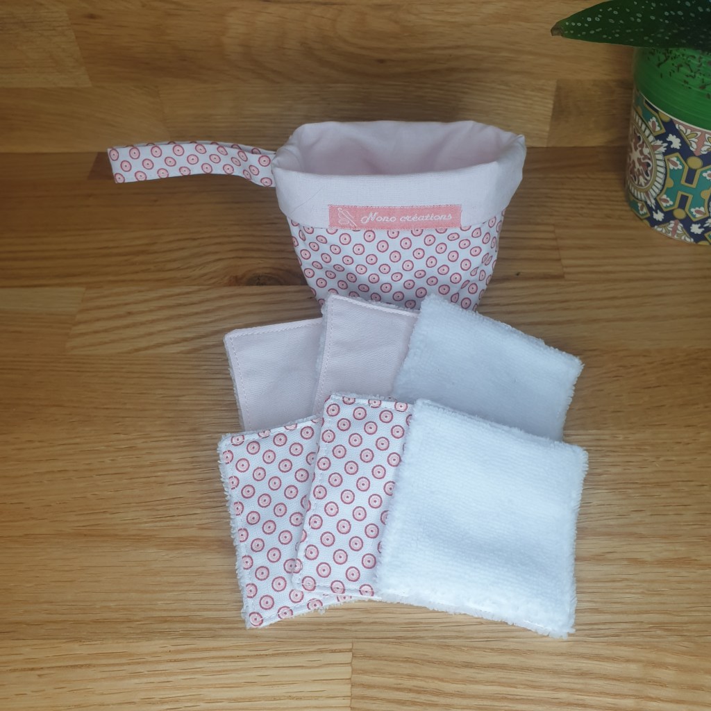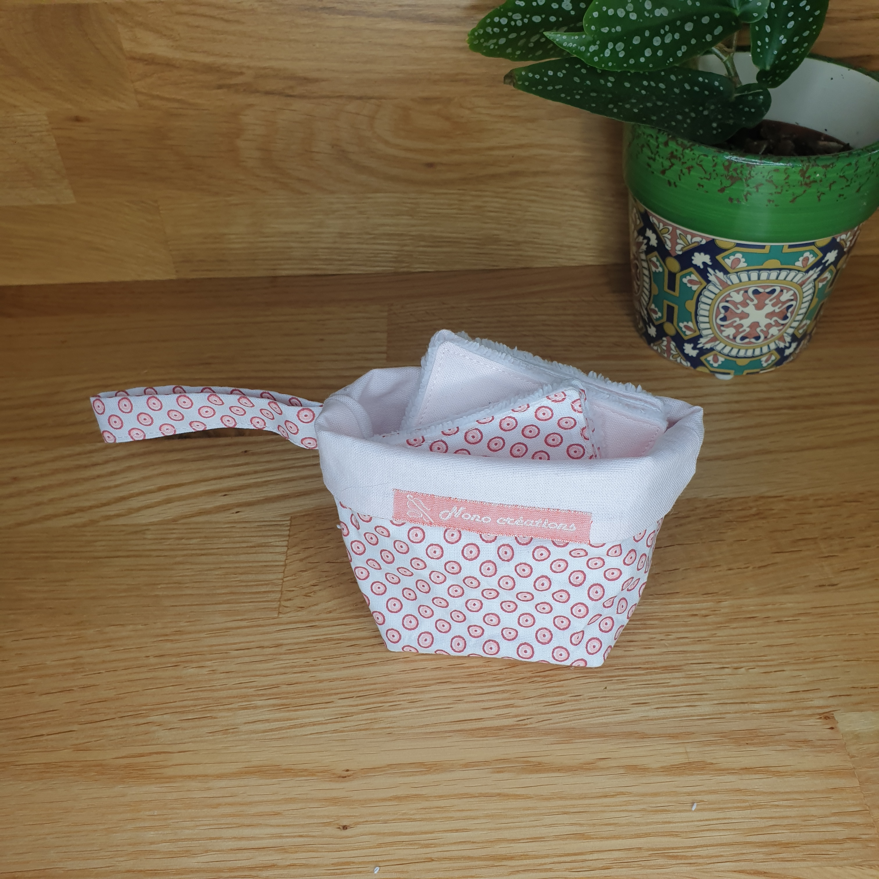 6 lingettes lavables et son panier. Lingettes de 6 cm de côté. Modèle « 70’s rose ».