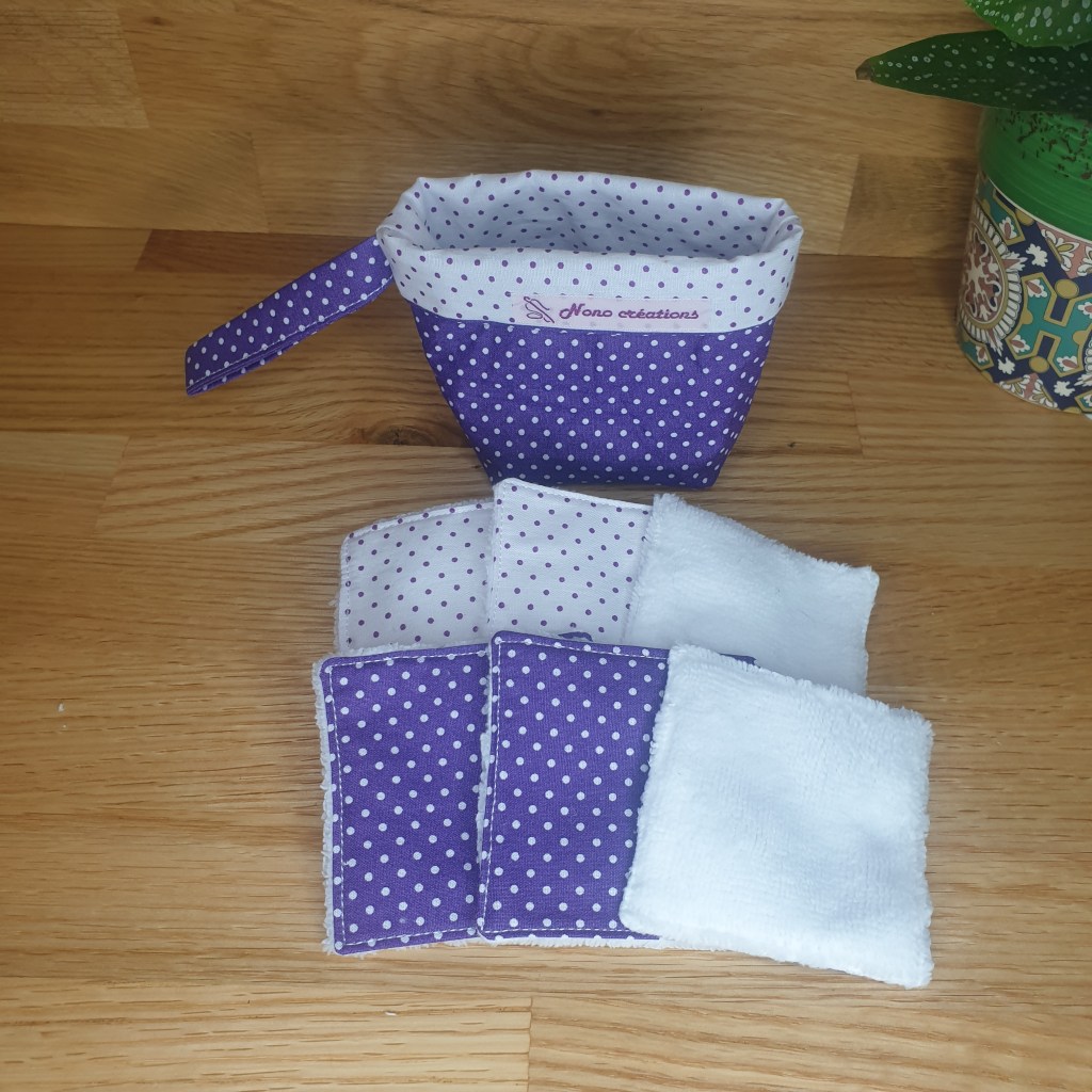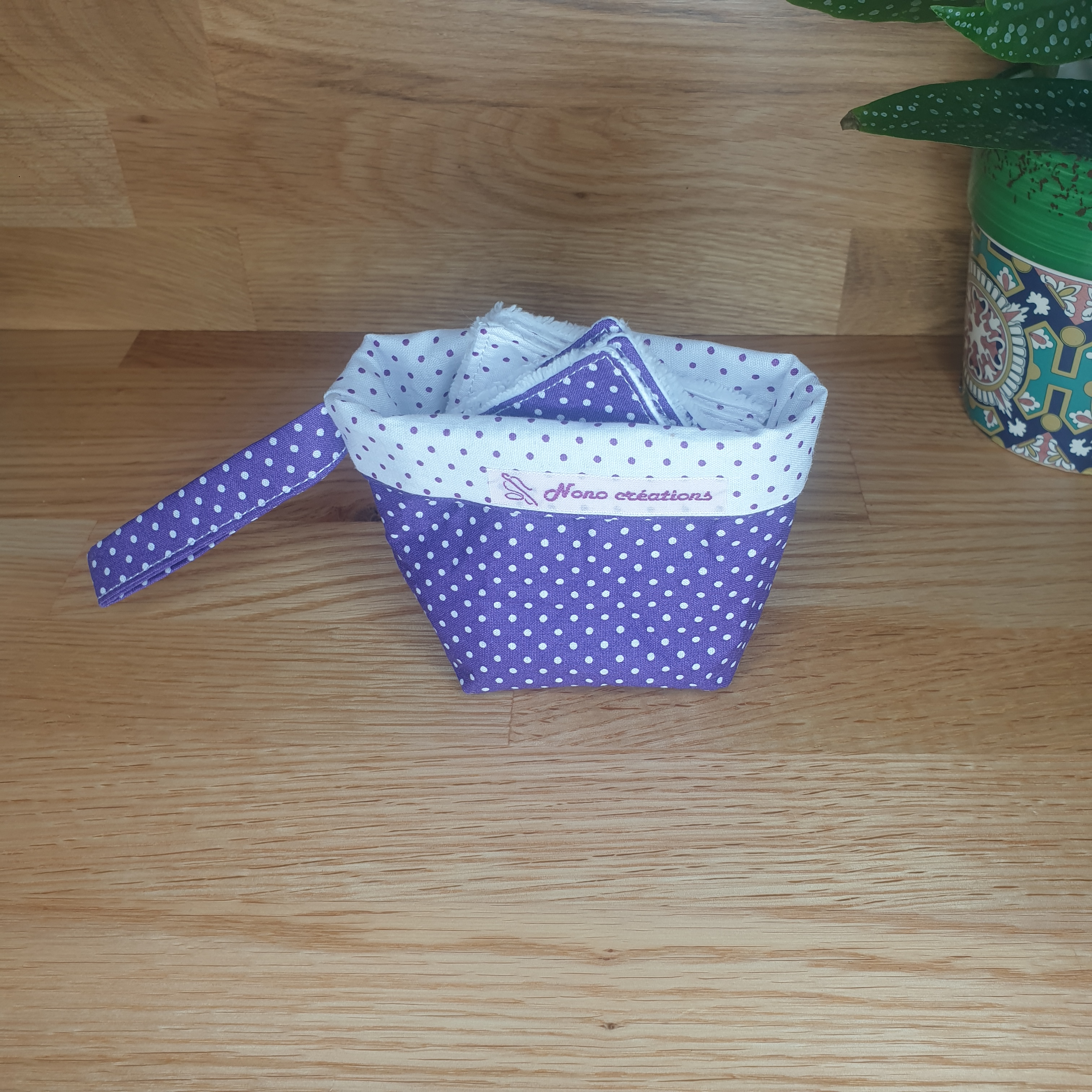 6 lingettes lavables et son panier. Lingettes de 6 cm de côté. Modèle « pois violet ».