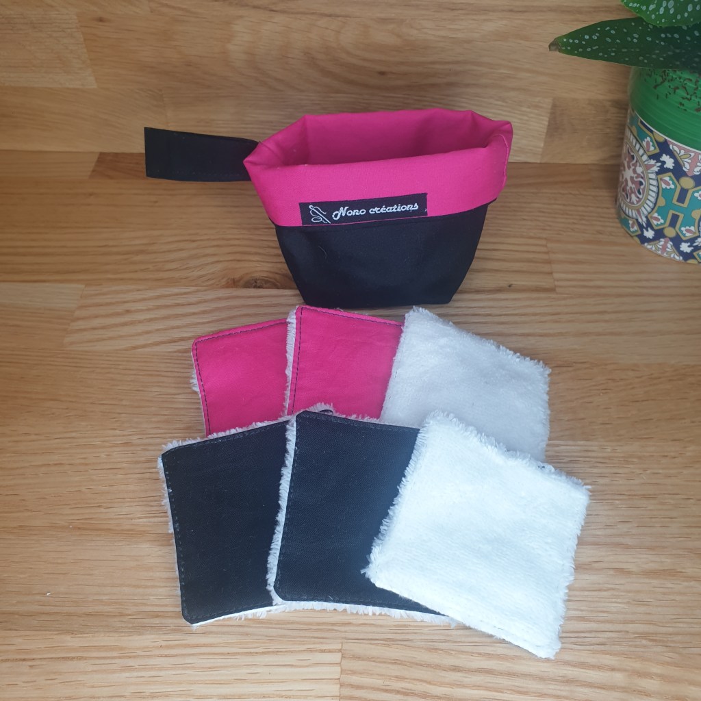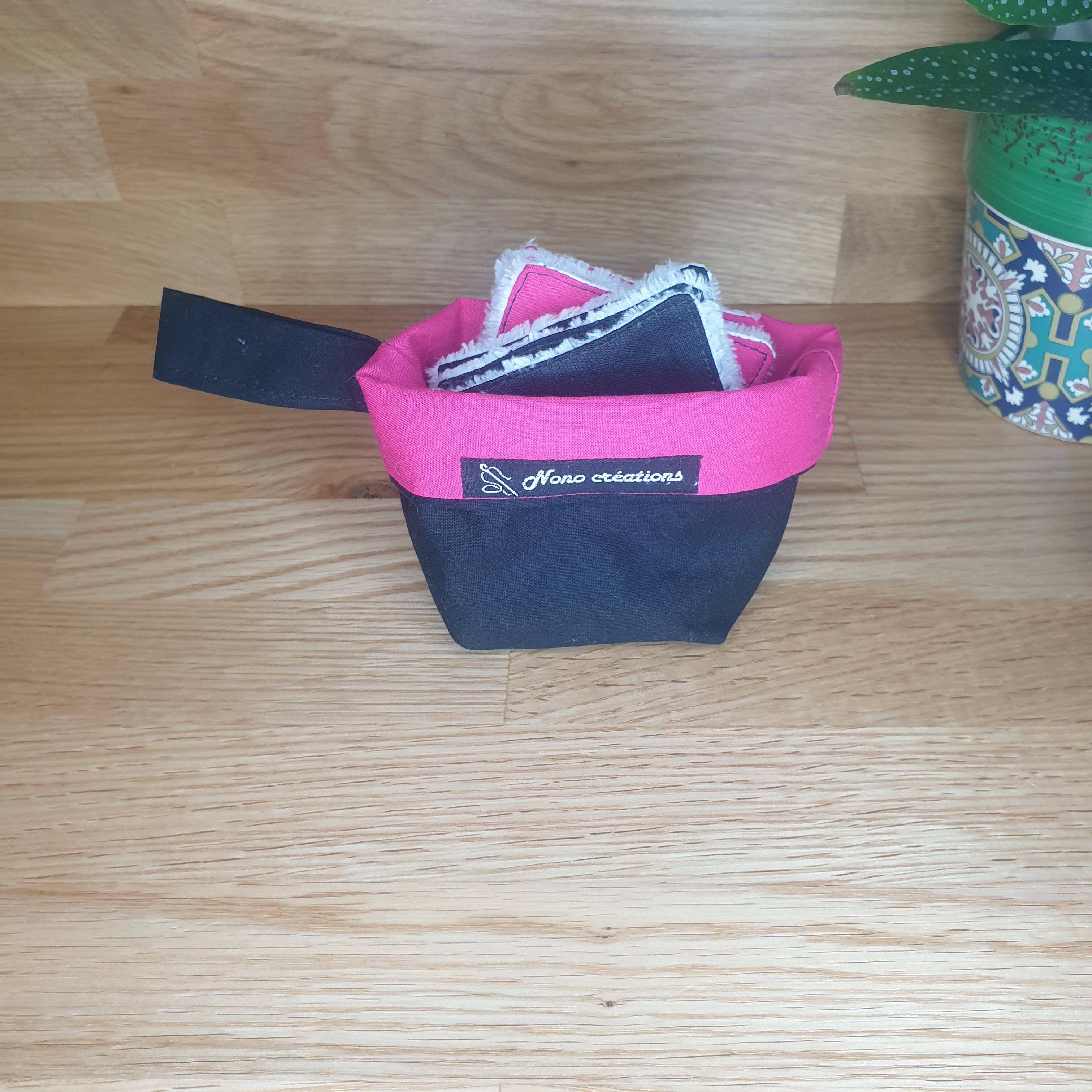 6 lingettes lavables et son panier. Lingettes de 6 cm de côté. Modèle « rose/noir ». Existe aussi en rose/bleu foncé.