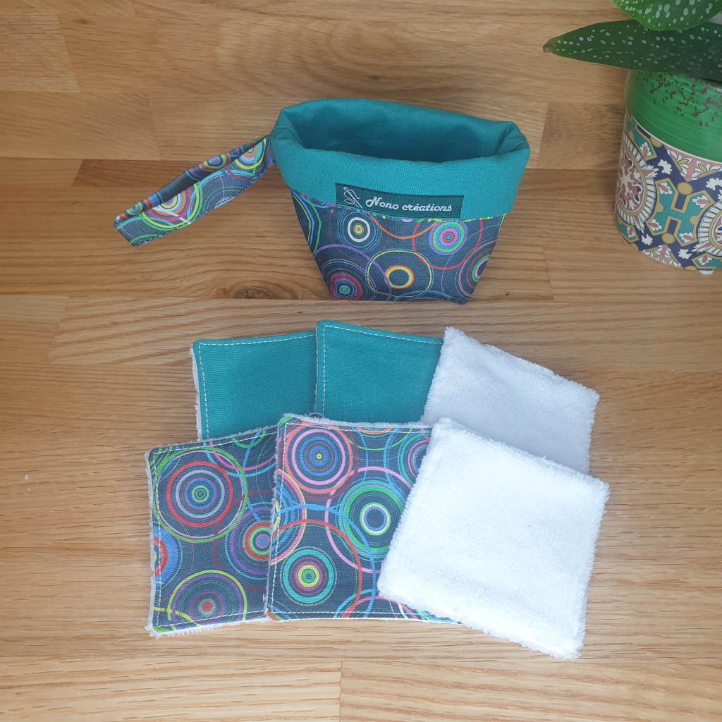 6 lingettes lavables et son panier. Lingettes de 6 cm de côté. Modèle « vert d’eau ».