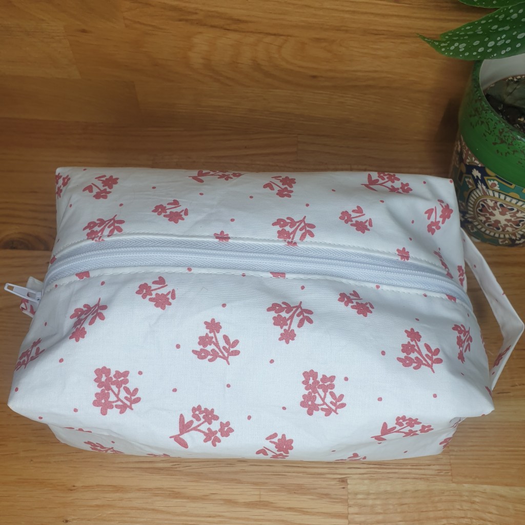 Trousse de toilette en coton enduit avec anse 20 cm de long, 14 cm de large et 7cm de haut. Modèle « enduit fleur ».